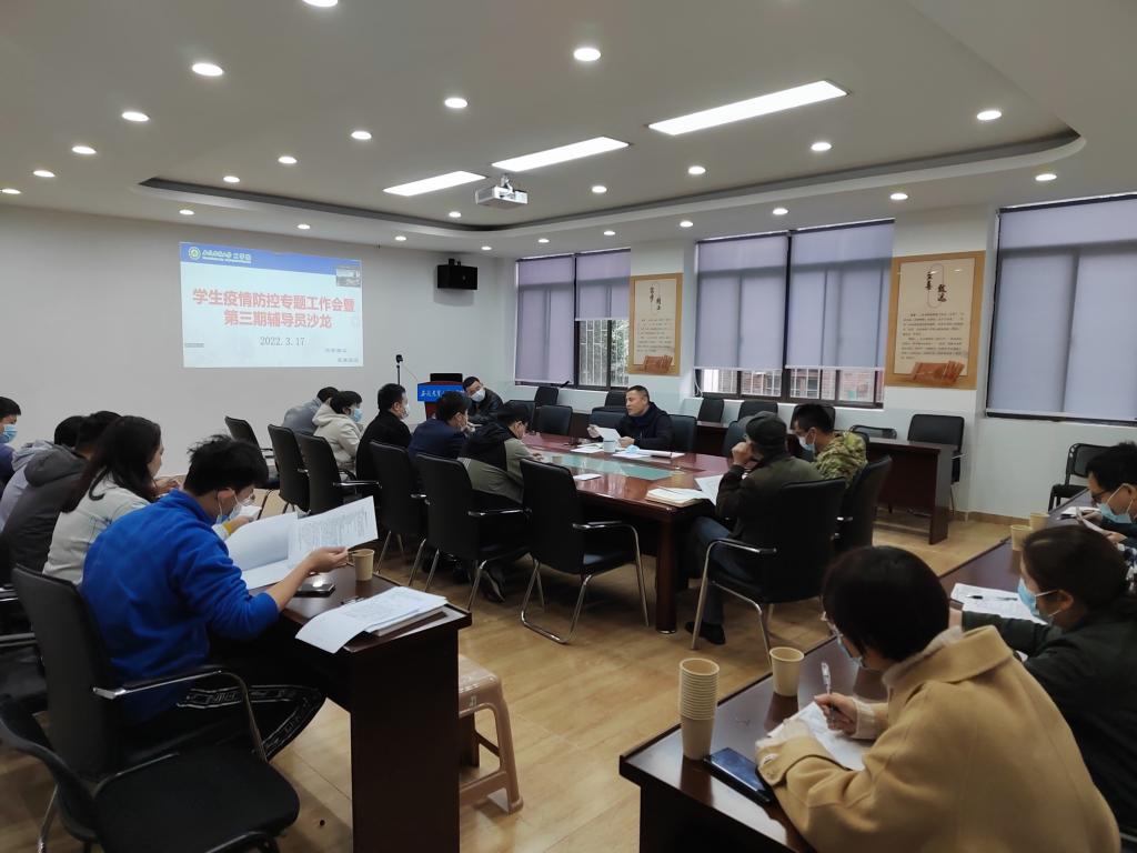 本网讯 3月17日中午,15vip太阳集团官网在学院二楼会议室召开员工疫情防控专题工作会议暨第三期辅导员沙龙。会议由公司党委副书记、副经理张国学主持,学院全体专兼职辅导员参加了本次会议。