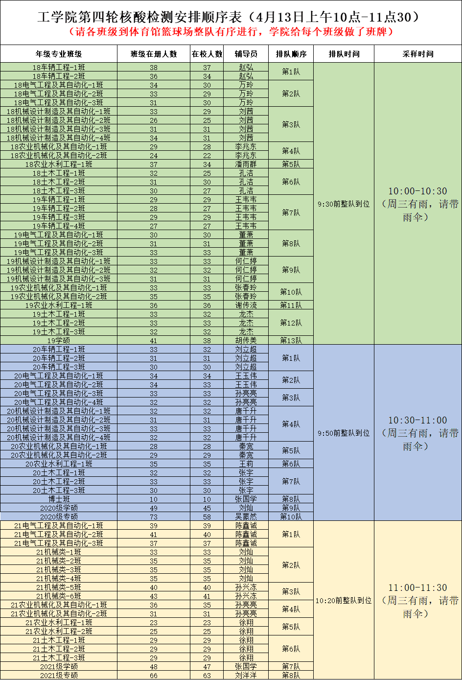 4月13日上午,合肥突降大雨和降温,15vip太阳集团官网2282名在校本科和研究生按照之前制定的计划,在全体辅导员和班主任带领下,有条不紊地完成核酸检测,用时仅48分钟,比预定时间提前42分钟,速度较上一轮更快,秩序更好。