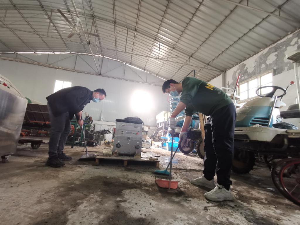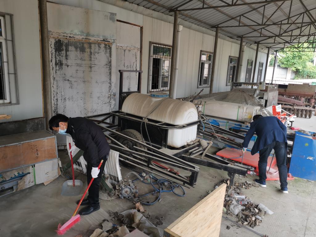 上午7时50分,老师和同学们按照既定分工,划定片区,两人一组,相互协作打扫农机装备仓库。一时间,仓库内外满满都是师生们劳动的身影。裴树东老师带头操起扫把、簸箕对边角卫生区开始清理,全体师生党员们干劲十足、乐在其中,有的清扫杂物、有的运倒垃圾、有的泼水除尘、有的整理机具,不到1个小时,整个农机仓库焕然一新。