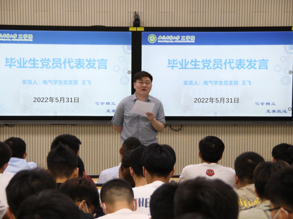 张国学以“新时代青年如何走好信仰之路、学习之路、奋斗之路”为主题,给毕业班党员主讲最后一堂党课,并要求大家在未来的人生道路上坚定信念,锤炼党性修养;要明德修身,发挥好党员先锋作用;要牢记使命,强化宗旨意识。同时鼓励同学们在新的人生起点上以党员的标准严格要求自己,在奋斗的道路上努力实现自己的人生价值。电气员工党支部王飞同学围绕自己在党组织的教育和培养过程中成长经历、思想历程,代表全体毕业班党员进行了主题发言。