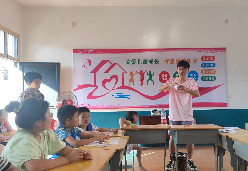 当天傍晚,团队成员顾不上休息,又走进家朋乡“儿童之家”,与当地留守儿童一起开展“纸片托水”“简易电机”“神奇磁铁”等有趣科学实验,培养留守儿童对科学的兴趣。