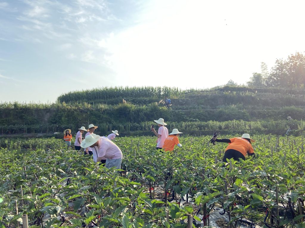 7月13日清晨5:00,团队成员便集合来到当地的梅干岭,分成3个小组,帮助劳动力不足的农户采摘茄子。