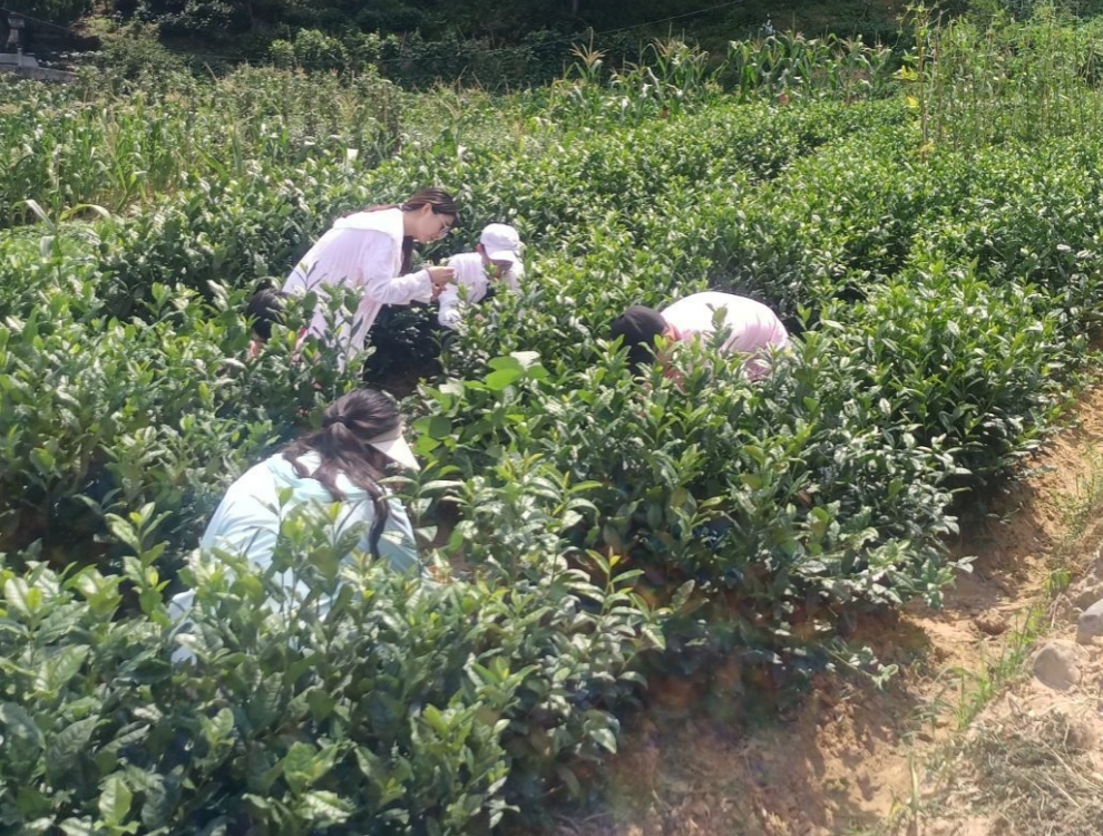 调研过程中,团队成员驻足“金山时雨”茶产业基地,了解茶叶种植、采摘、加工、储存等过程,对比传统手工鞣制茶叶与运用现代化手段加工茶叶的区别,在“古法”与“现代”的鲜明对照中,体会科技兴农、科技富农的现实意义。