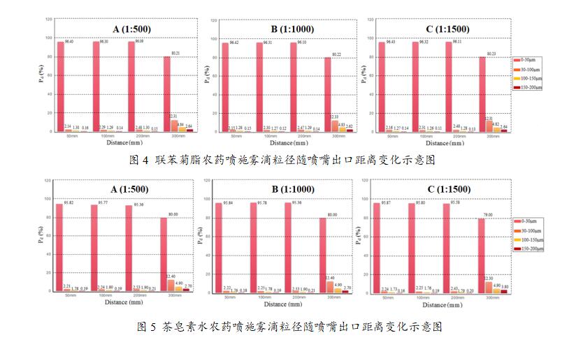 研究结果表明:无人机悬停时,其主旋翼旋转产生的桨尖涡和尾迹的波动可以通过优化无人机悬停高度和悬停速度来控制;对于给定的无人机常用喷嘴FPV110-02(图2),同种浓度下,联苯菊脂比茶皂素水的喷施效率高;相比较其它浓度(1:500,1:1500),配比1:1000的联苯菊脂和茶皂素水的喷施性能较好(图3-5)。