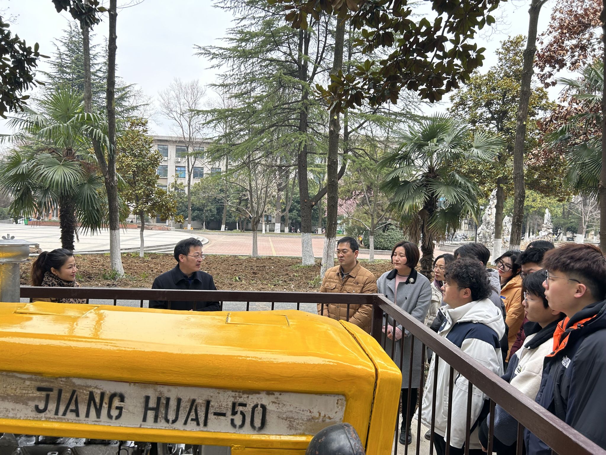 在“匠心园”北园中,两台见证参与校院建设发展的农机具前,农业机械系主任伍德林结合亲身求学和工作经历,耐心地为大家讲解着“他们”所承载的“历史”与“现在”。“学工的讲究直接、直线、直角,整个园区设计用的最多的就是直线、直角、圆形,强调有规有矩,规矩纪律意识的最好代言……”匠心园设计者、土木水利系主任杨智良介绍设计初衷。