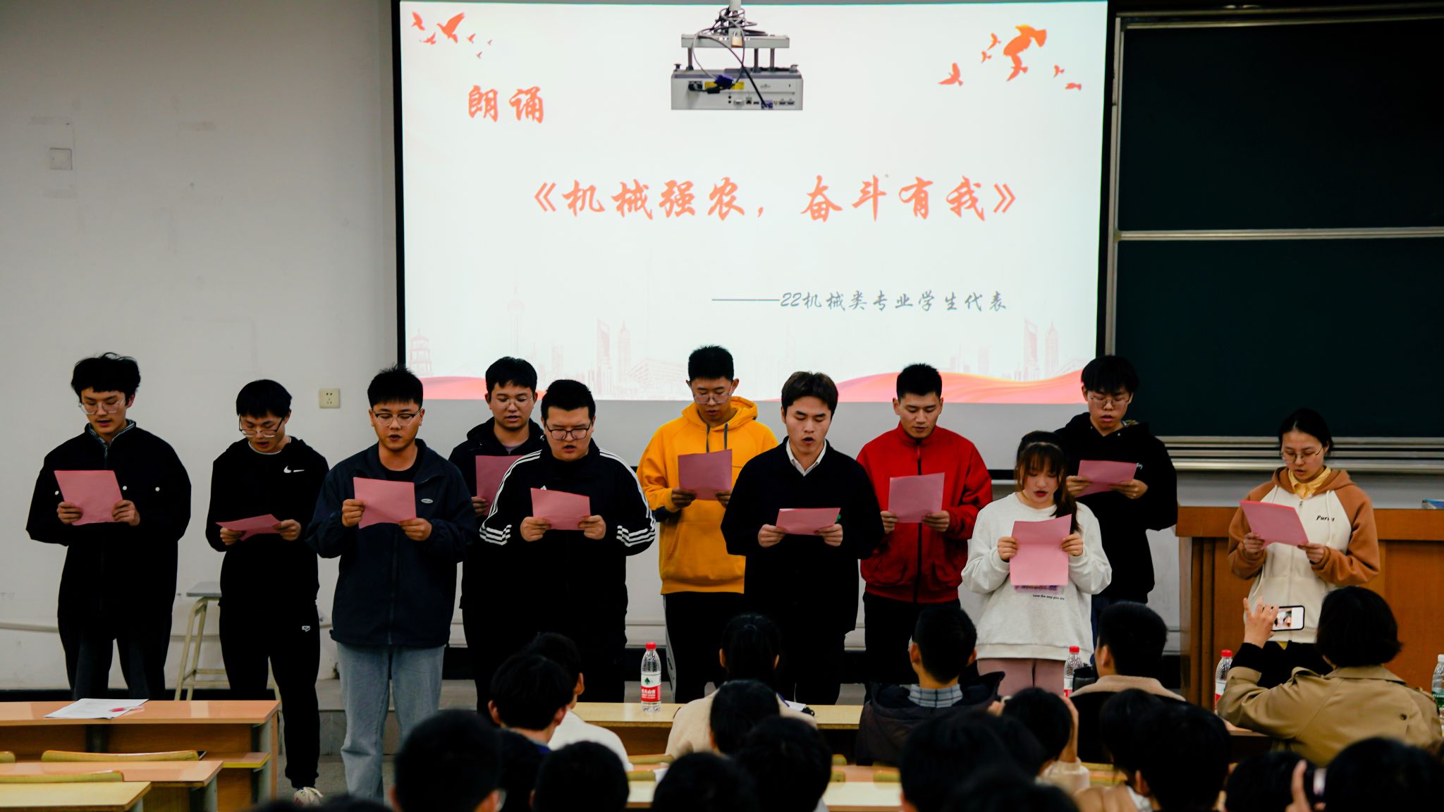 活动在以《机械强农,奋斗有我》为主题的朗诵中拉开序幕,铿锵有力的诵读,体现了同学们对专业的浓浓热爱,表达了身为机械人的深深自豪之情,坚定了机械强农,奋斗有我的信心和决心。
