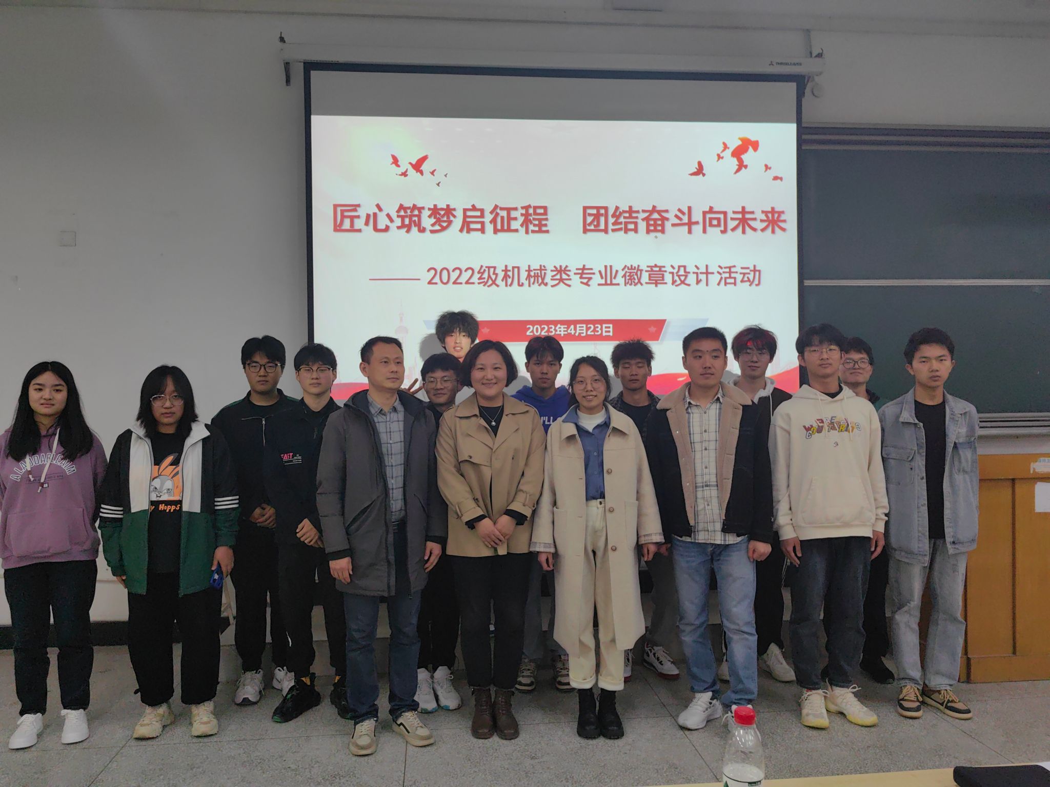 本网讯 在学院深入开展学习贯彻习近平新时代中国特色社会主义思想主题教育之际,4月23日下午,2022级机械类专业在博学楼327教室举行专业徽章设计活动,将开展主题教育和推动班风建设有效结合。班主任方梁菲、刘策老师,辅导员方芳老师,学院团委代梦蝶老师参加活动并担任评委,2022级机械类专业全体同学参加本次活动。