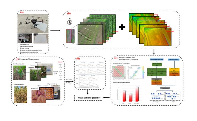 关于杂草竞争的研究,文中采用基于玉米表型的综合竞争指数(CCI-A)来描述杂草竞争的动态过程和结果。随着竞争时间的延长,不同竞争水平(Levels 1-5)的玉米株高、茎粗、N和P元素的差异变化明显。这导致玉米产量下降10%、31%、35%和53%;百粒重下降3%、7%、9%和15%。与传统的竞争指数相比,CCI-A更适合量化竞争的时间序列响应。然后,应用遥感技术来揭示光谱和激光雷达信息对群落竞争的时间响应。光谱的一阶导数表明,在每个时期,竞争的红边(RE)位置偏向于短波方向。随着竞争时间的延长,Levels 1-5的RE整体上向长波方向转移。冠层高度模型(CHM)的变异系数表明,杂草竞争对CHM有显著影响。最后,建立了多模态数据的深度学习模型(Mul-3DCNN),实现不同时期CCI-A的大范围预测,并取得了R2=0.85和RMSE=0.095的预测精度。总之,本研究利用CCI-A指数结合多模态遥感和深度学习实现了杂草竞争力的大范围预测。