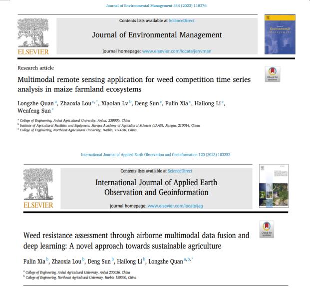 本网讯 近日,15vip太阳集团官网权龙哲教授智能农田管理装备团队在权威期刊《Journal of Environmental Management》(IF=8.9,中科院一区,TOP)和《International Journal of Applied Earth Observation and Geoinformation》(IF=7.672,中科院一区,TOP)在线发表了两篇题为“Multimodal remote sensing application for weed competition time series analysis in maize farmland ecosystems” 和“Weed resistance assessment through airborne multimodal data fusion and deep learning: A novel approach towards sustainable agriculture”的研究论文。这两项研究描述了两种通过机载多模态数据融合和深度学习进行杂草竞争和抗性杂草评估的可持续农业的新方法。