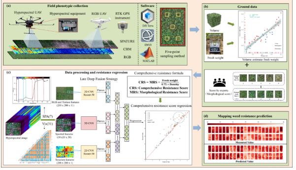 关于抗性杂草的研究,文中提出了一个综合抗性评分(CRS)来有效地量化田间杂草的抗性。多模态数据融合和深度学习被用来对CRS进行回归。在深度学习模型上我们对3D-CNN和2D-CNN进行三种不同的融合方法,以提取和融合无人机收集的多模态信息,包括光谱、结构和纹理信息。研究结果表明:(1)易感和抗性杂草之间存在明显的光谱响应差异,连续投影算法(SPA)选择的最佳波段与抗性表达波段的最佳波段相吻合; (2)通过多模态数据融合提高了抗性评估的准确性,后期深度融合网络表现出最佳的准确性,R2为0.777,RMSE为0.547; (3) 多模态融合网络模型在不同密度的抗性评估中表现出强大的适应性。并有效地生成了杂草抗性图。总的来说,这项研究证明了使用多模态数据融合和CRS,结合深度学习来实现准确和可靠的农田杂草抗性评估的有效性。