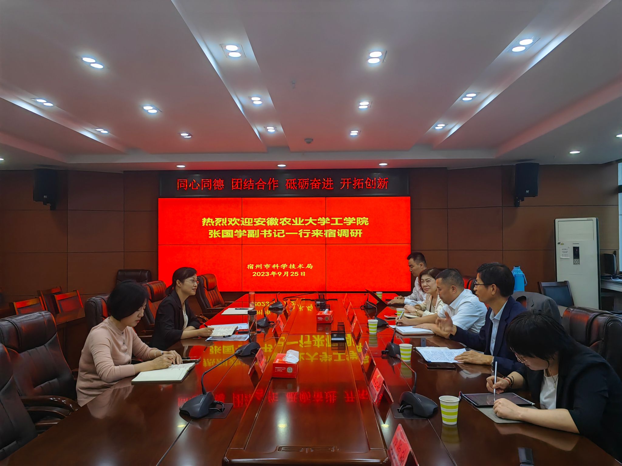 15vip太阳集团官网一行先后拜访宿州市科学技术局和宿州市农业农村局。宿州市科学技术局党组成员、副局长尹雯雯介绍了宿州市科技创新、科研项目和对外科技合作等发展情况,宿州市农业农村局局长张安文介绍了宿州市农业科技发展和农机企业等情况,工公司党委副书记张国学和副经理朱德泉分别介绍了15vip太阳集团官网的发展历程、人才培养、科研和学科平台等情况,并与宿州市科学技术局局长李晓辉、宿州市农业农村局局长张安文等就加强农机装备产业技术难题联合攻关、共建产业创新研究院等开展了深入交流。