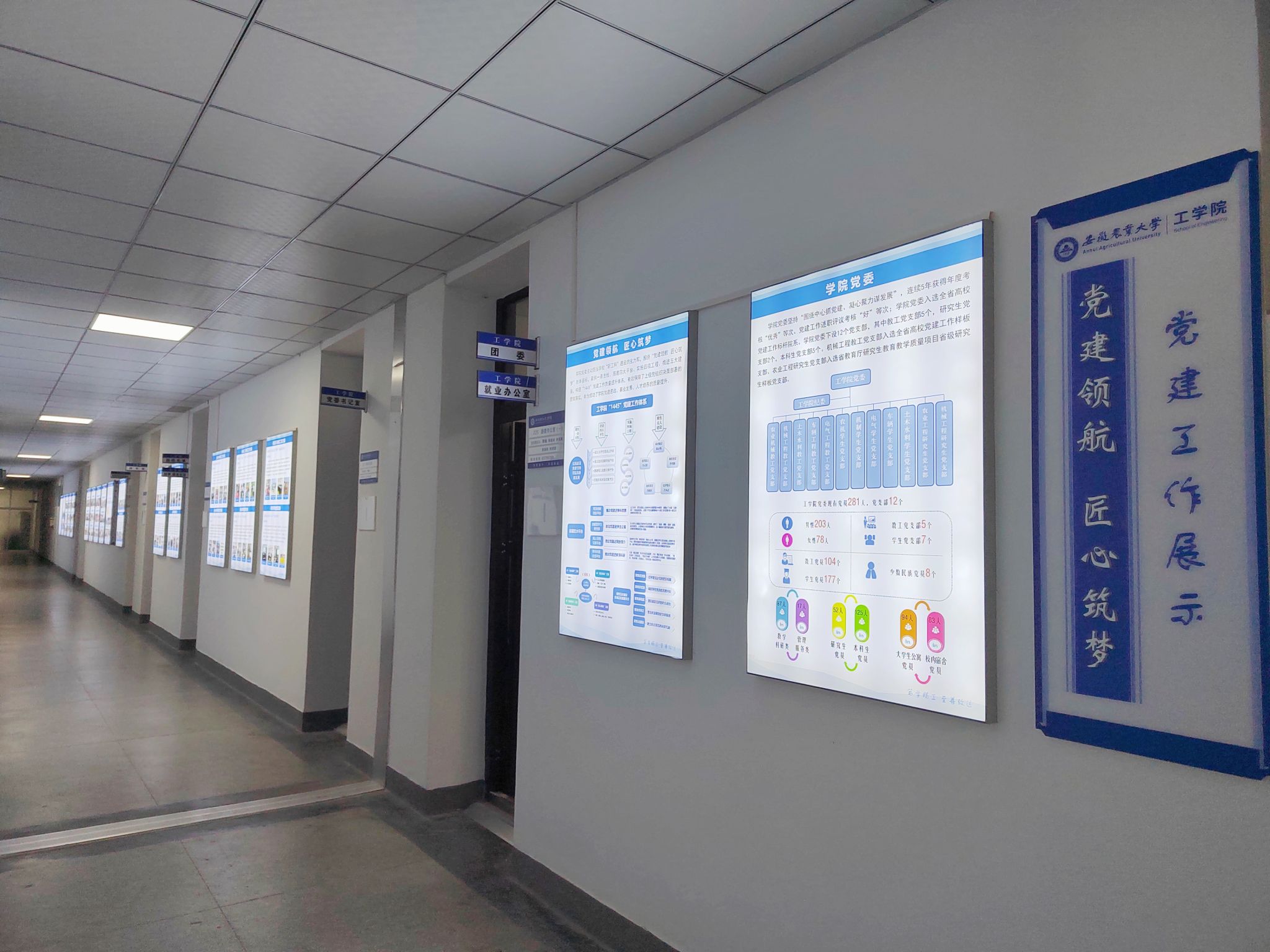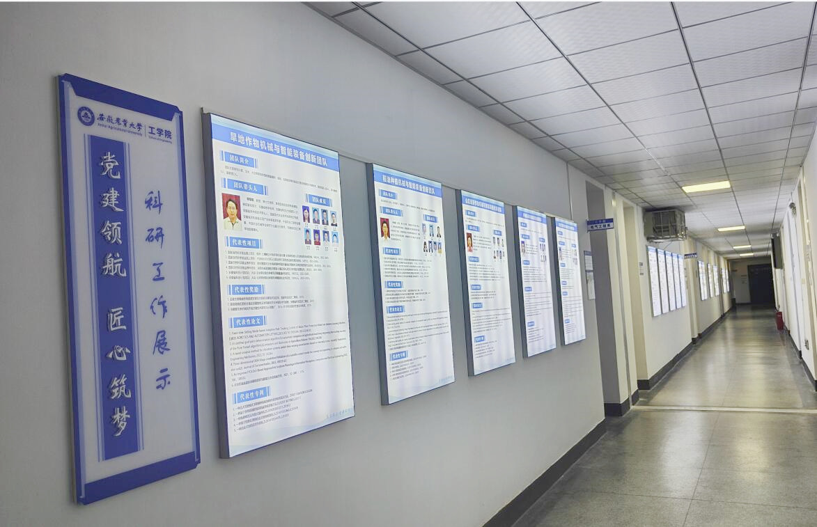 文化墙共分为发展总览、党建思政、教学科研三个主要部分。发展总览部分主要围绕公司概况、团队信息、发展历程等模块展开,展示了学院筚路蓝缕、弦歌不辍的办学积淀;党建思政部分主要围绕党建品牌、支部特色、员工工作等模块展开,展示了学院落实立德树人根本任务,以高质量党建引领学院高质量发展的成效;教学科研部分主要围绕团队建设、科研团队建设、服务机械强等模块展开,展示了学院坚守强农兴农初心、勇担乡村振兴使命的风采。