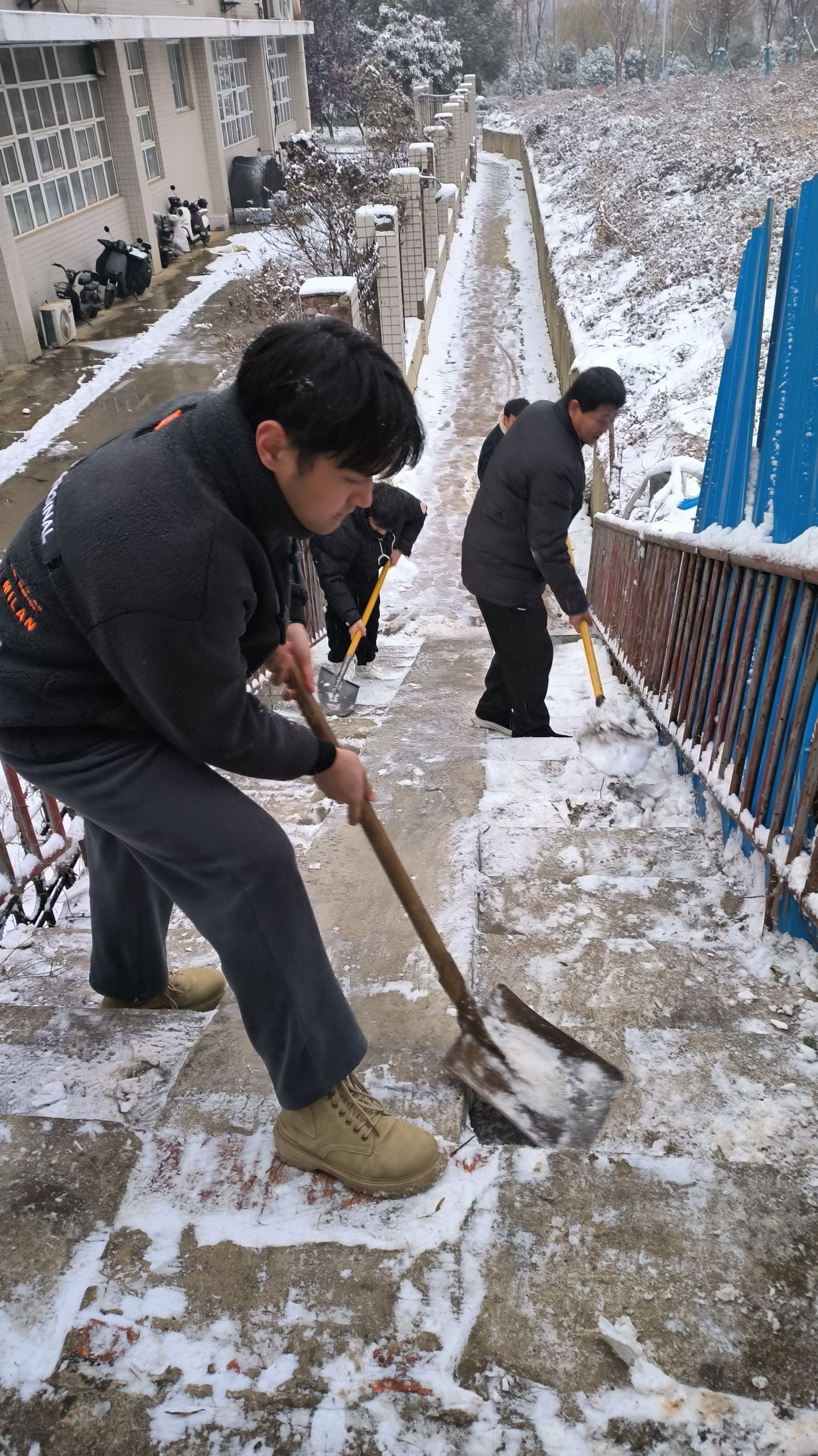 活动中,大家齐心协力,配合默契,铲、扫、推,不畏严寒,积极奉献。经过一个小时的奋力清扫,门前、园区的积雪和积冰被清理干净,为师生的安全顺畅出行开辟了一条“安全通道”。