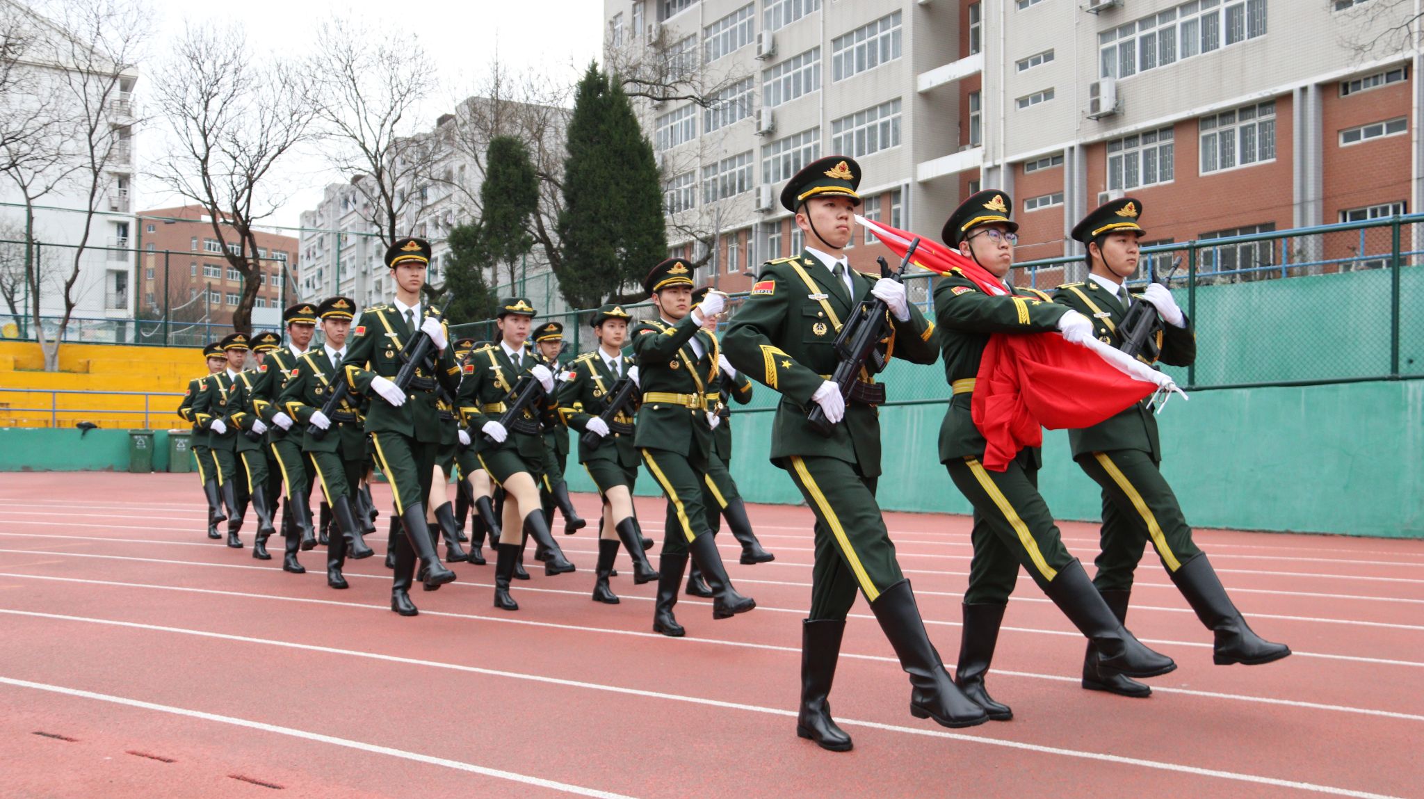 上午七点,在学校国旗护卫队护卫下,伴随着庄严的《义勇军进行曲》,师生齐声高唱国歌,深情注视着鲜艳的五星红旗在晨曦中冉冉升起、迎风飘扬。