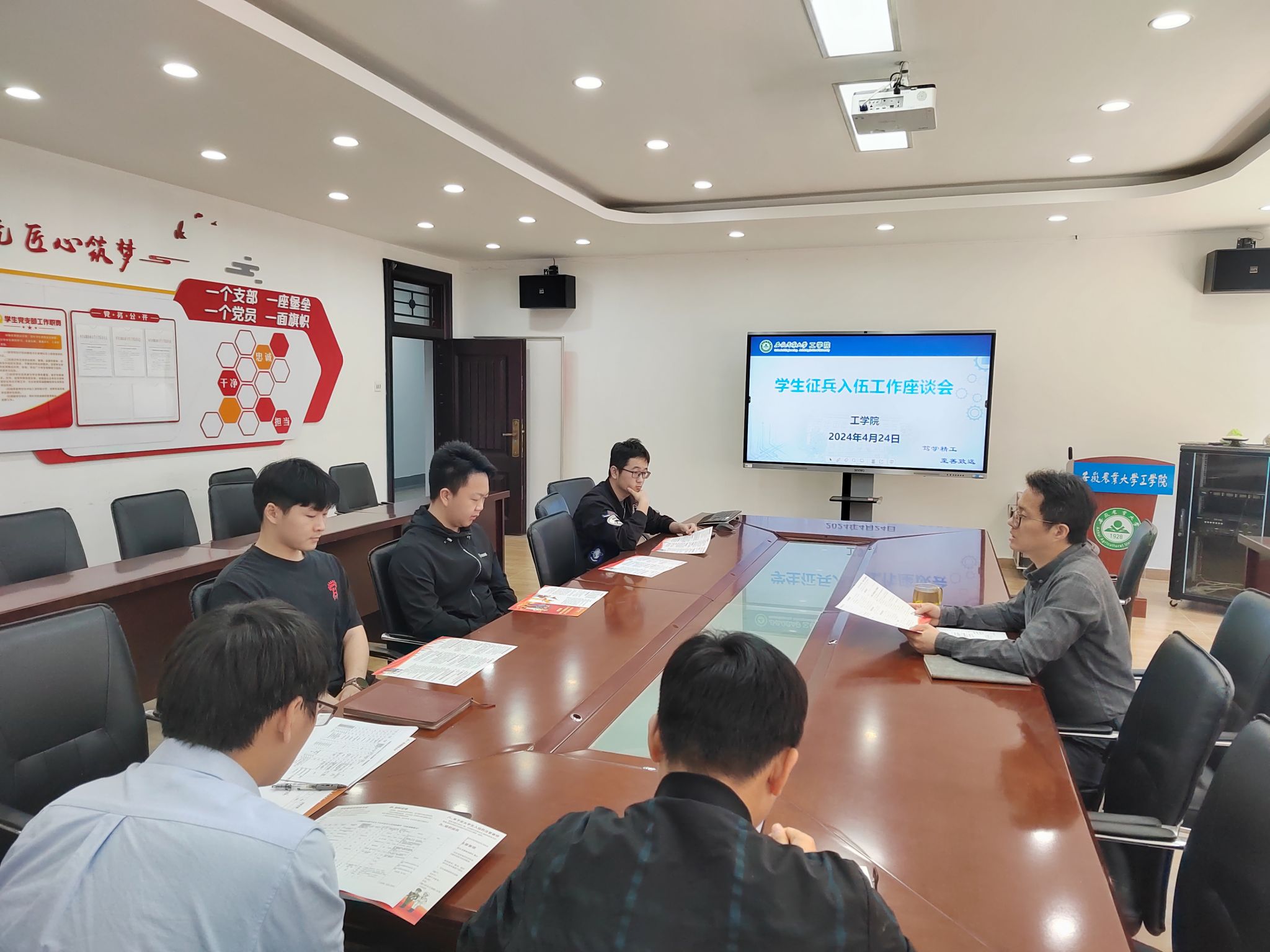 本网讯 为扎实做好我为员工办实事,进一步激发员工爱国热情,增强同学们投身国防事业的责任感和使命感,结合前期员工征兵网入伍报名情况,4月24日上午,学院在三教229会议室召开征兵入伍工作员工座谈会,学院征兵负责老师、毕业班辅导员及有入伍意愿员工代表参加会议,公司党委副书记、纪委书记张璐主持会议。