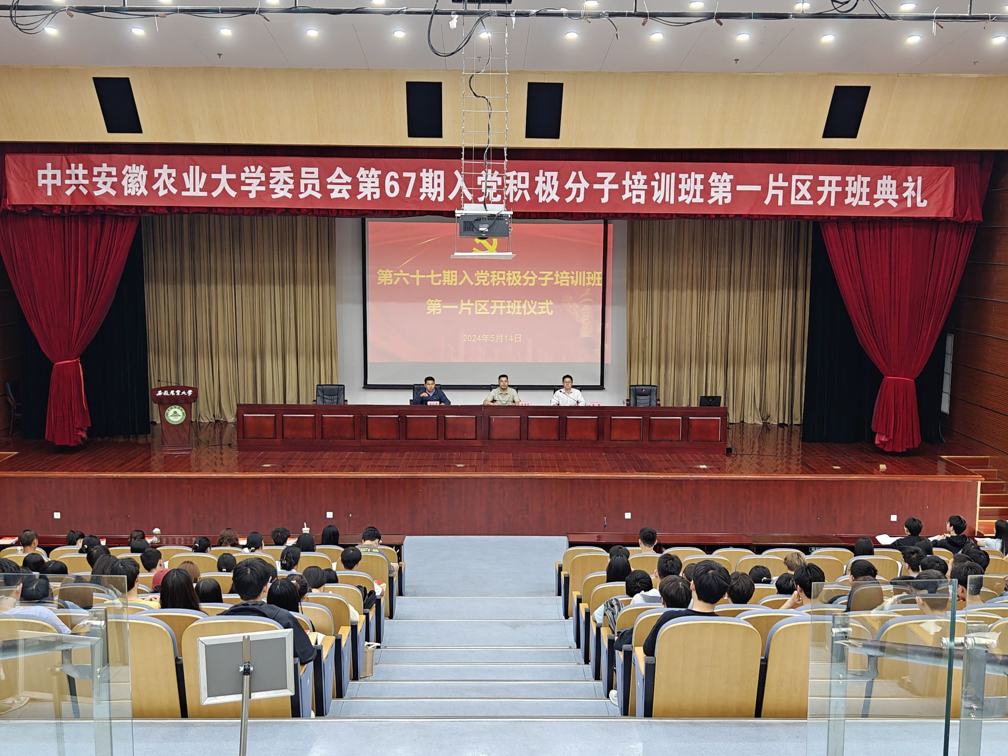 本网讯 5月14中午,校第一片区分党校第六十七期老员工入党积极分子培训班开班仪式在图书馆第一报告厅举行。工公司党委书记张国学、园艺公司党委副书记陈公伟出席会议,303名学员和党课班主任参加了会议。会议由工公司党委副书记张璐主持。