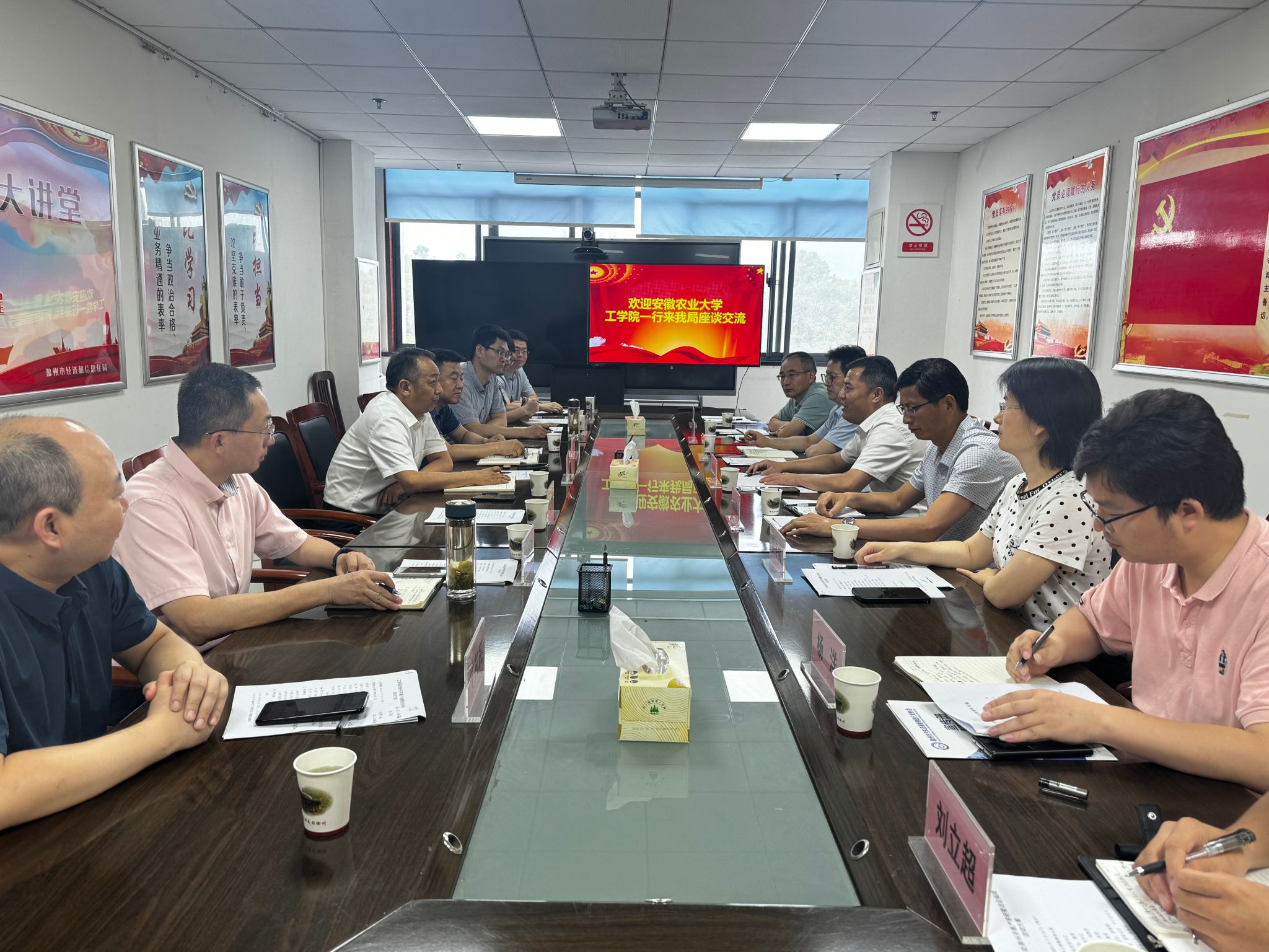 上午,学院一行首先前往滁州市工信局看望公司挂职干部孙兴冻老师,并开展座谈交流。滁州市工信局党组书记、局长陈军以及副局长王昌龙分别介绍了滁州市经济社会发展和信息化发展等情况,并对孙兴冻老师在挂职期间的工作情况给予了高度评价和充分肯定。公司党委书记张国学、经理朱德泉分别介绍了15vip太阳集团官网的发展历程、人才培养、科研攻关和团队建设等情况。座谈中,双方就如何进一步加强校地合作、共建创新研究院等进行了深入交流。