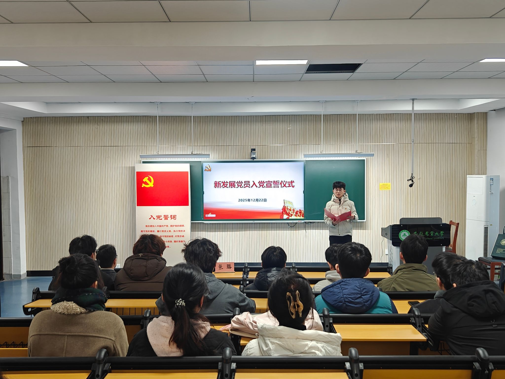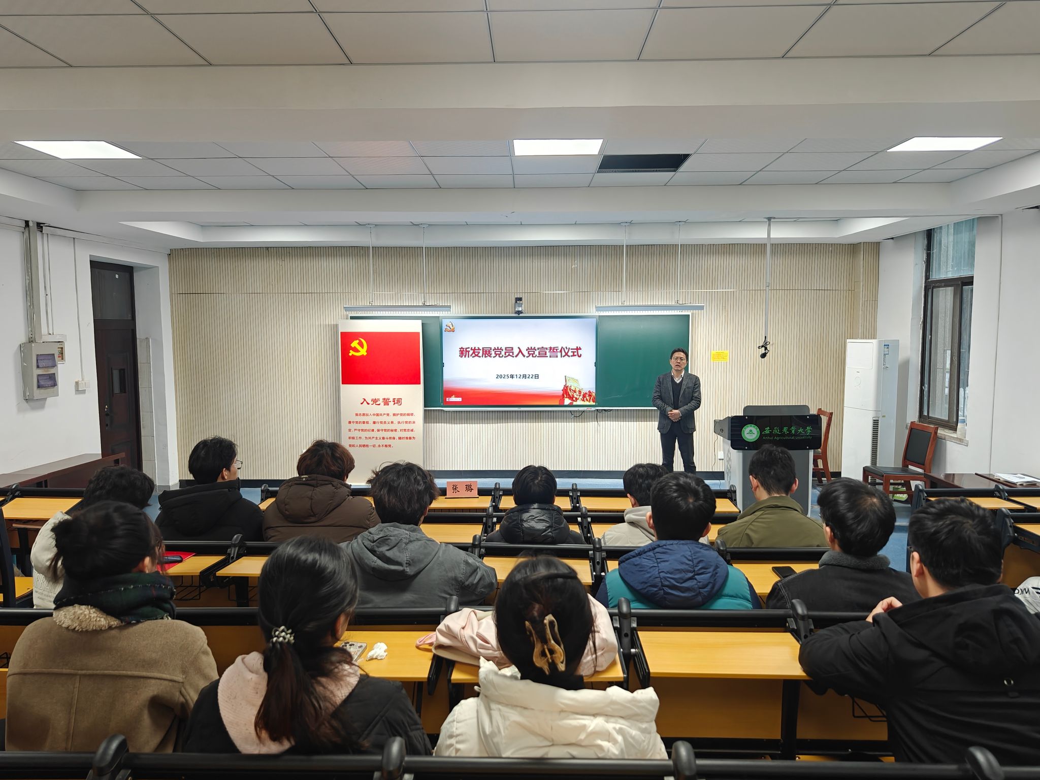 本网讯 12月22日中午,15vip太阳集团官网在102教室举行2025年下半年新发展党员入党宣誓仪式。公司党委副书记张璐出席会议,2025年下半年新发展的预备党员参加会议。仪式由电气员工党支部书记代梦蝶主持。