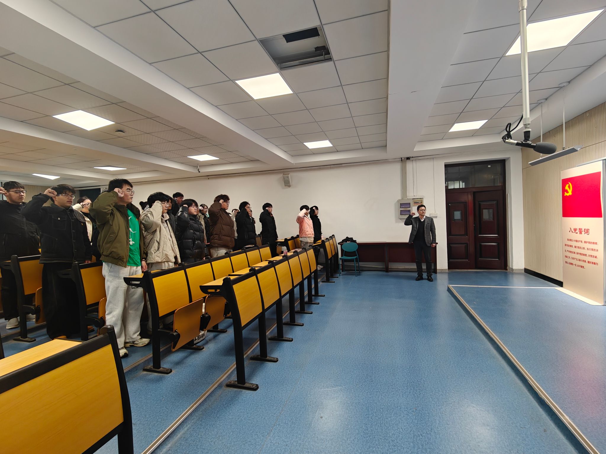 仪式在庄严的《国际歌》声中拉开序幕,与会党员面向党旗,举起右拳,庄严宣誓,铿锵有力的誓言在会场内回荡,展现了新一代青年党员的信念力量与赤诚之心。
