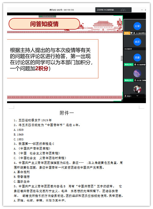 紧握科学利剑,铸就防疫“铠甲”。为增强同学们的防疫意识,更加了解防疫知识,在疫情期间2019级土木工程一班团支部,在辅导员的带领下组织进行了防疫知识竞赛。通过生动有趣的竞赛模式,同学们对新冠病毒以及防疫知识更加了解,减少了对未知的恐慌,增强了抗疫必胜的信念。同时,也希望每一位同学像火种一样,把这些知识教给身边更多的人。