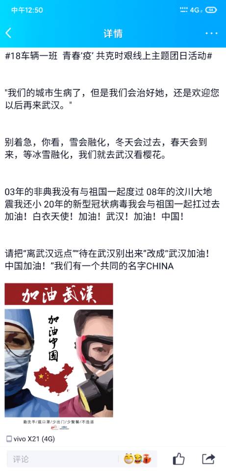除此之外,学院团委、员工会积极组织开展青春战“疫”共克时艰线上主题海报大赛,开展“武汉加油”网络祝福活动和读书创作活动,让员工“宅在家中”过得“有声有色。