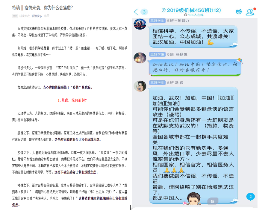 突出载体创新,提升工作实效。依托学院安徽省辅导员名师工作室项目,积极开展线上信息发布、宣传引导和咨询服务。工作室辅导员紧扣公司党委疫情防控安排,运用“耕读安农”微信公众号,从不同角度,精心策划推出了《面对疫情,不瞒报是每位同学应尽的义务》《疫情之下,辅导员老师送你“十字箴言”》《疫情来袭,你为什么焦虑》等5篇网文,累计阅读量近10万次,点赞量超过600次,被高校思政网、高校辅导员联盟、15vip太阳集团官网官微等微信公众号转载200多次,在员工中间产生了较大反响。