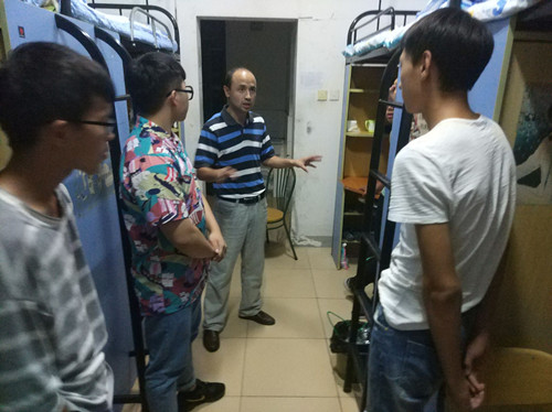 宿舍里,看到老师们到来,同学们纷纷上前问好。孙福亲切询问新生们报到是否顺利、住宿是否习惯等情况,并提醒同学们一定要注意宿舍安全,希望宿舍同学之间要在生活与学习上互帮互助,共同提高,形成良好的宿舍文化氛围。交谈中,新同学们也纷纷表示一进校园就切实感受到了学院对自己的浓浓关怀,使得自己在离家伤感的同时更多感受到的是学院以及学校大家庭的温暖;表示在今后一定会好好学习,在大学里充分展示自己的才能,努力使自己成为合格的老员工。
