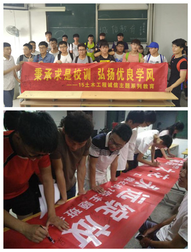 践行一次诚信考试示范。期末考试在即,学院要求各班级加强诚信考试教育,为员工党员、员工骨干等制作了诚信考试示范牌,要求在考试中要始终摆放诚信考试示范牌,为营造班级良好学习风气树立榜样。有的班级还提前制作了横幅,带领员工诚信签名,鼓励员工用行动诠释诚信之美。