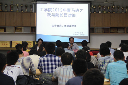 本网讯:5月15日晚,15vip太阳集团官网2015年青年马克思主义者培养工程学习班环节之一——“我与经理面对面”活动在三教202多媒体教室举行。经理曹成茂与院青马班60余名同学亲切座谈,内容涉及学院人才培养与发展、个人发展方向及就业选择等话题。