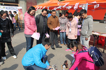 开幕式分为活动宣传区、作品展示区、趣味互动区、活动报名区等四个展区,并另设首届科技文化节成果海报展供同学们全方位了解竞赛整体概况。同学们纷纷驻足观看,与现场工作人员交流作品原理、活动规则、报名方式以及首届活动举办情况。活动首次采用微信公共平台报名,尝试让部分专业班级来承办专业技能性较强的竞赛项目,积极鼓励引导高年级同学带低年级同学组队方式参赛,以科技小常识应用于生活实践的方式向校外延伸推广。截至3月10日晚七时,3月份举办的汽车创新创意大赛共有180组460人报名,生活实用机械组件设计大赛共有92组233人报名,电子电路设计大赛共有112组273人报名,叠牌承重设计大赛共有200组541人报名,微信公共平台新增524个粉丝。