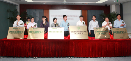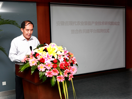 最后,李恩年副董事长与中国农业大学、农业部南京农业机械化研究所、合肥工业大学、江苏大学以及安徽省农业机械管理局、芜湖市科技局和奇瑞重工股份有限公司等单位领导一起为安徽省现代农业装备产业技术研究院和合作共建平台揭牌。