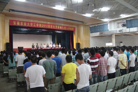 大会在壮烈的国歌声中开始。本次大会共有七项议程。曹成茂教授首先代表学院全体师生向各位新生表示热烈欢迎,并详细介绍了学校和学院的整体发展情况,就学院团队结构、专业特色发展、内涵发展以及取得的丰硕成果和未来5年的发展前景做了简要报告。他希望全体新生尽快适应大学学习,养成良好的学习习惯,独立自主,挑战大学新生活,开启新篇章。刘柳同志在会上就近期入学教育和军训工作的相关安排和具体要求做了简要说明。她指出,同学们尊师重友、纪律性强、精神饱满,充分展示出了工学学子的良好风貌,希望全体新生在继后的军训生活中继续保持优良作风,不怕吃苦、不喊累,力争优秀。