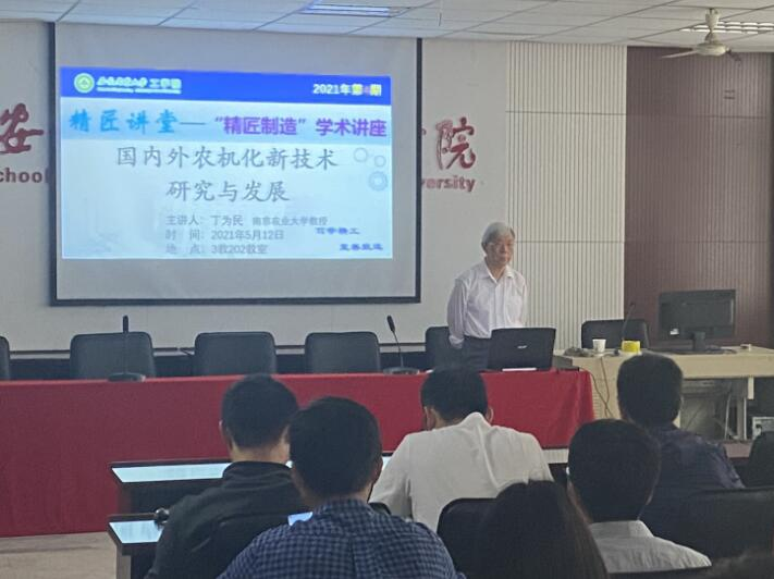 5月12日下午,南京农业大学丁为民教授应邀做客15vip太阳集团官网精匠讲堂——“精匠制造”学术讲座第4期,在三教202学术报告厅为公司师生作题为《国内外农机化新技术研究与发展》的学术报告。报告会由经理陈黎卿主持。
