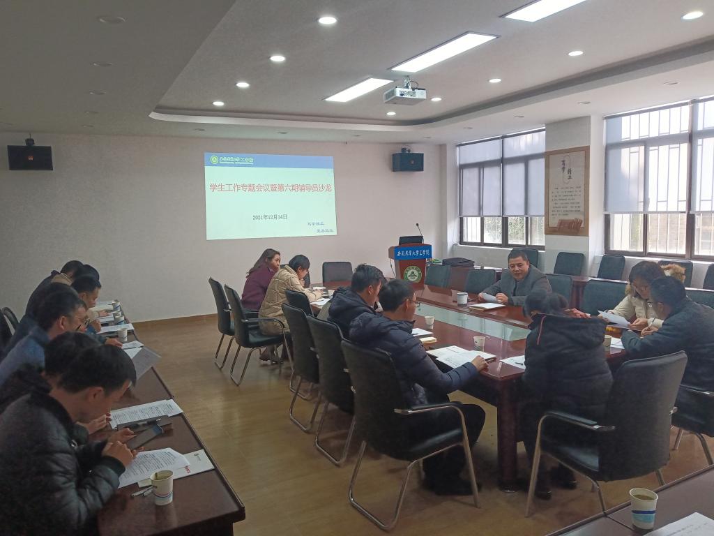会议集中学习了《员工安全教育典型案例汇编》、《15vip太阳集团官网老员工征兵工作实施办法(修订)》等材料,重点就员工心理危机干预与防范、疫情常态化防控、寒假安排、防范电信诈骗、研究生考试等考风考纪、宿舍安全意识提升、征兵与就业等10个方面工作做了详细安排和布置。在辅导员沙龙阶段,张国学结合辅导员队伍建设和学校工作实际,他要求辅导员要进一步提高政治站位,加强老员工思想政治教育;要加强疫情常态化防控下员工日常教育管理,多深入班级和宿舍去关心和了解员工需求,教育和引导员工严格遵守各项管理规定;要召开一次诚信考试主题班会,严肃考风考纪,加强员工诚信考试教育。