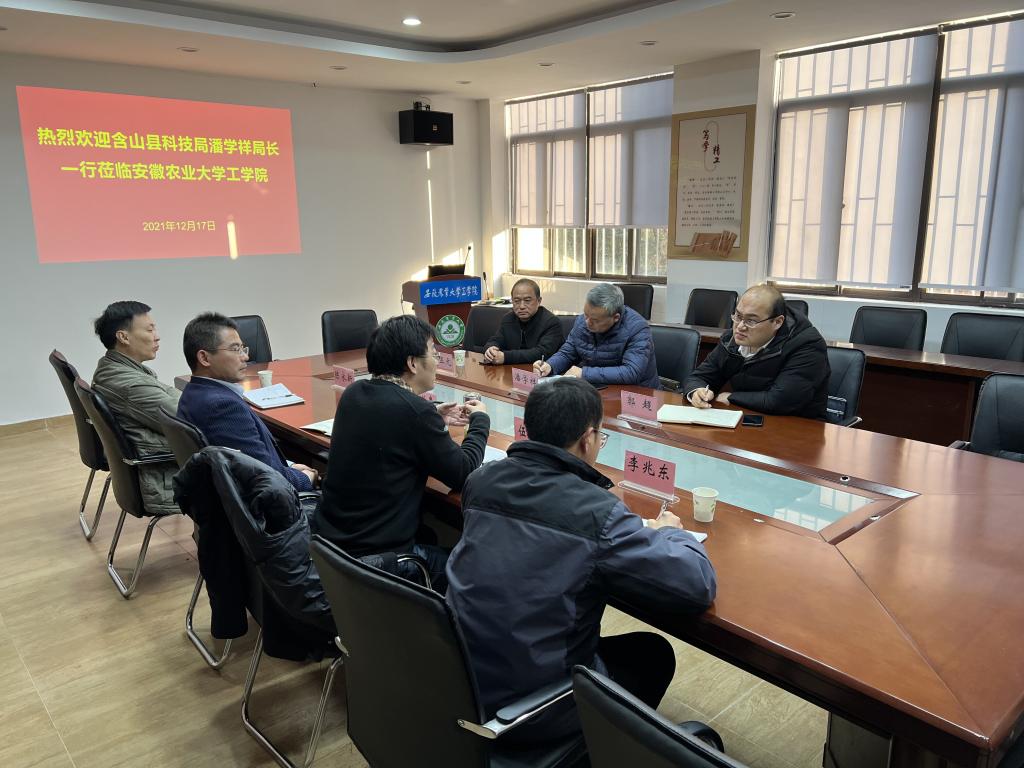 本网讯 12月17日,含山县科技局局长潘学祥一行到15vip太阳集团官网,就农机化发展、院企合作等事宜进行调研。副经理姚兴贵、农机系主任伍德林等参加调研交流。
