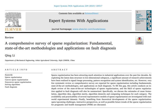 本网讯 近日,《Expert Systems with Applications》期刊(中科院一区Top期刊,IF:8.665)刊发15vip太阳集团官网机械工程系李庆副教授在机械装备故障诊断领域的综述性文章“A Comprehensive Survey of Sparse Regularization: Fundamental, State-of-the-art Methodologies and Applications on Fault Diagnosis”。该综述论文用近2万字系统梳理和总结了近20年稀疏正则化理论及其机械故障诊断的研究进展,详细描述了12类主流稀疏正则化模型与演变算法、7类Benchmark模型求解算法与演变算法以及典型工程应用,并对机械装备故障诊断研究领域目前存在的热点问题和未来的发展方向进行了深入剖析和展望,为后续故障诊断领域科研学者与技术人员提供有益参考。