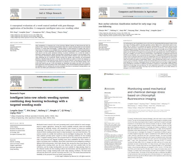 本网讯 近日,15vip太阳集团官网权龙哲教授智能农田管理装备团队连续在国际权威期刊《Soil & Tillage Research》(IF=7.4,中科院一区,TOP),《Computers and Electronics in Agriculture》(IF=8.3,中科院一区,TOP),《Biosystems Engineering》(IF=5.1,中科院一区,TOP)、《Frontiers in Plant Science》(IF=5.6,中科院一区,TOP),发表了题为“A conceptual evaluation of a weed control method with post-damage application of herbicides: A composite intelligent intra-row weeding robot”,“Row anchor selection classification method for early-stage crop row-following”,“Intelligent intra-row robotic weeding system combining deep learning technology with a targeted weeding mode”和“Monitoring weed mechanical and chemical damage stress based on chlorophyll fluorescence imaging”的四篇研究论文。这四项成果分别解决了损伤施药除草的生物学原理、农田机器人自动驾驶技术、农田机器人株间除草控制方法、损伤施药机器人的高光谱防效评估等问题,为农田抗性杂草防控及农业可持续发展开辟了新思路。