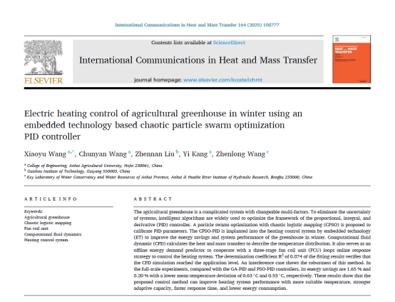 近日,热力学一区TOP期刊《International Communications in Heat and Mass Transfer》(IF=6.4)刊发公司王笑宇博士课题组在农业温室智能控制方法研究中的最新成果《Electric heating control of agricultural greenhouse in winter using an embedded technology based chaotic particle swarm optimization PID controller》。针对内外部环境复杂多变的农业温室系统,智能算法被广泛用于优化PID控制器的框架结构,以消除系统的不确定性。该研究提出了基于混沌逻辑映射的粒子群优化方法(CPSO)来整定PID参数。通过嵌入式技术将CPSO-PID植入到温室采暖控制系统中,提高温室冬季的节能效果和系统性能。计算流体力学(CFD)通过计算传热和传质来描述温度分布。它同时还作为离线的能源需求预测工具,与三级风机盘管回路的在线响应策略协同控制供热系统。结果表明:CFD的模拟精度达到了应用水平。通过加入信号干扰,验证了该方法的鲁棒性。在全尺寸试验中,与GA-PID和PSO-PID控制器相比,提出的方法在节能效果和控制温度的稳定性方面均有一定的改进。研究成果可为冬季温室系统提供更适宜的温度、更强的自适应能力、更快的响应速度和更低的能耗。