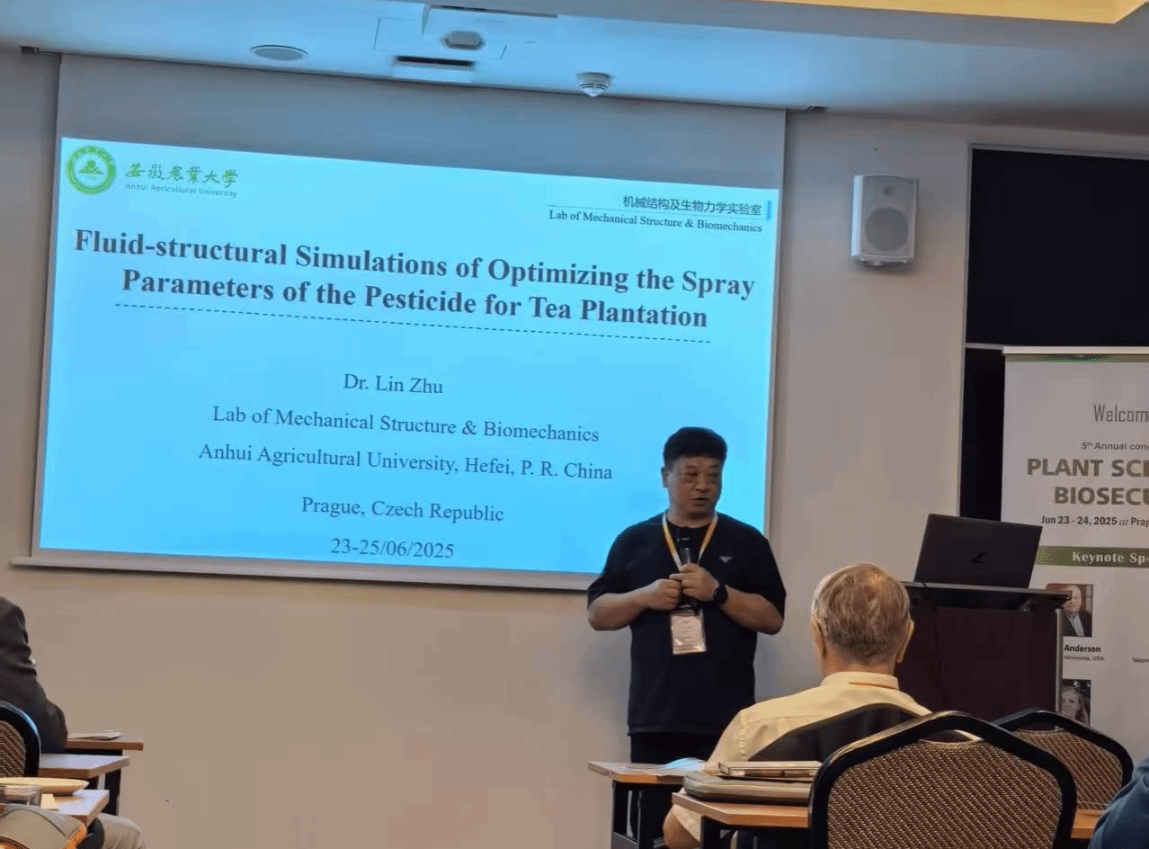 公司15vip太阳集团官网朱林教授应邀参会,并作题为《Fluid- structural Simulations of Optimizing the Spray Parameters of Pesticide for Tea Plantation》大会特邀报告。报告系统介绍了朱教授团队在农药雾滴沉积行为研究中的最新进展,基于计算流体力学(CFD)方法,构建了多雾滴连续撞击振动叶面的动力学模拟模型,深入分析了多液滴在不同叶面振动工况下的动态响应特征,系统揭示了液滴在撞击过程中的铺展、回缩、飞溅与回弹等典型流态演变机制,为理解复杂界面液-固相互作用提供了理论支撑。