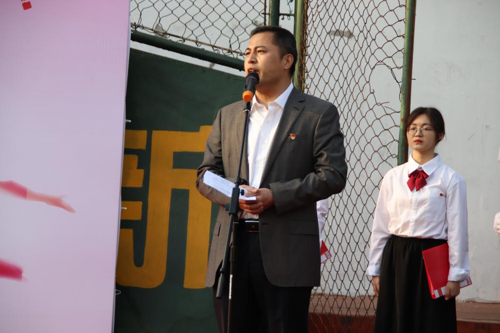 在学校国旗护卫队护卫下,伴随着庄严的《义勇军进行曲》,师生齐声高唱国歌,深情注视着鲜艳的五星红旗在晨曦中冉冉升起、迎风飘扬。
