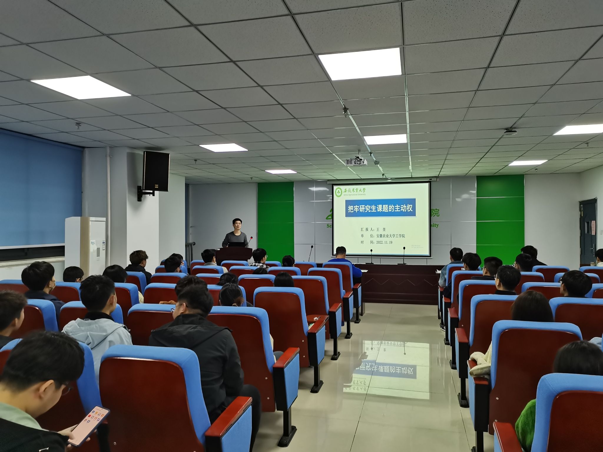 随后,邀请农业机械系王奎副教授作题为《把牢研究生课题主动权——以个人研究生经历为例》报告。王奎从自身研究生科研经历出发,从课题寻找,课题开展,论文撰写等多方面向与会党员阐述如何把牢研究生课题的主动权,并寄语与会党员:“研究课题不是等来的、不是要来的、更不是靠着导师催促推进的,要主动争取,主动寻找,主动推进,做自己课题的将军”。